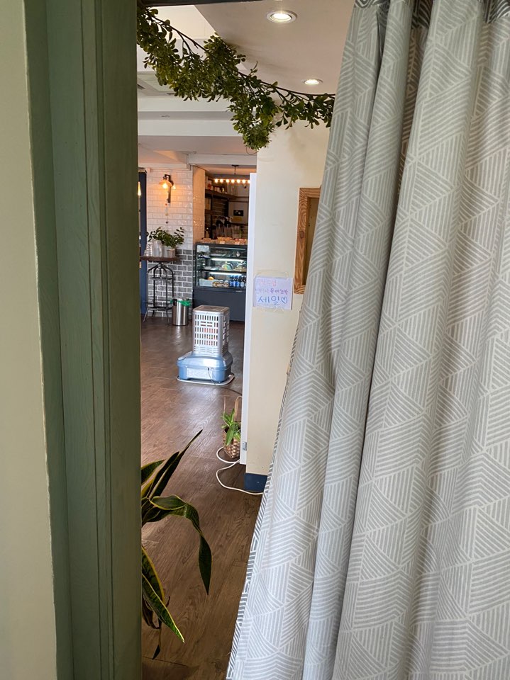 쌀국수집 내부 계단을 내려오면 이렇게 우측에 카페로 향하는 통로가 있어요. 커튼으로 막아놨는데 커튼을 치면